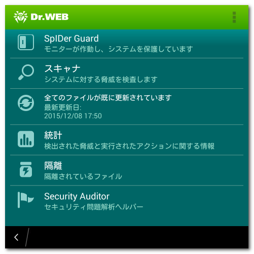 Dr.Web のメイン画面(図 2 参照)に、現在の保護状態が表示されます。また、以下のプログラム機能にアクセスすることができます: