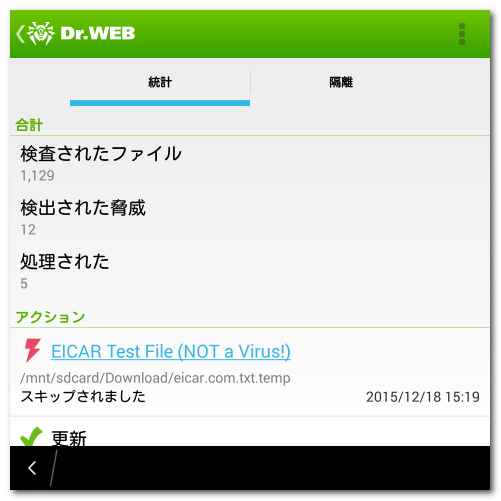 Dr.Web では、検出された脅威およびアプリケーションの動作に関する統計が保存されます。統計情報を確認するには、メイン画面でアプリケーションメニューを開き、統計 をタップします。