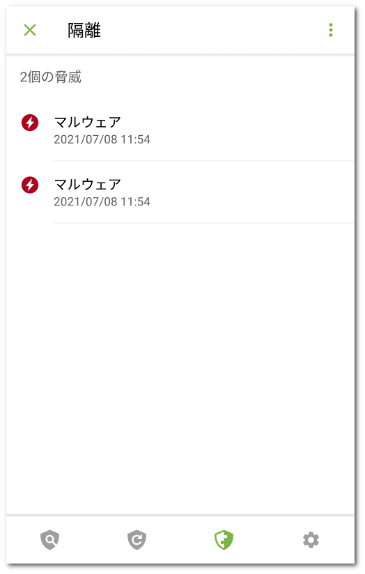 Dr.Webでは、検出した脅威を隔離フォルダへ移しファイルシステムから隔離することで、システムにダメージを与えないようにすることができます。 隔離されたファイルを表示する 隔離に移された脅威のリストを確認するには、ナビゲーションパネルで 脅威の情報を表示するには、リストで該当項目をタップします。 脅威ごとに次の情報が表示されます。 •ファイル名 •ファイルへのパス •脅威が隔離された日時 上にスワイプすると、脅威に関する情報を含むカードを展開できます。カードを折りたたむには下にスワイプします。 複数の脅威を含むアーカイブ内のすべての脅威のリストを表示するには、該当するアーカイブを選択し、脅威 行の 展開 をタップします。 利用可能なオプション それぞれの脅威に対しては、以下のオプションを使用することができます。 • •復元 - ファイルを、隔離に移される前にあったフォルダに復元します(このアクションはファイルが安全であると確認されている場合のみ使用してください)。 •削除する - ファイルを隔離領域とデバイスから完全に削除できます。 •誤検知 - 分析のためにDoctor Webアンチウイルスラボにファイルを送信します。分析によってファイルが脅威であるか、偽陽性であるかが分かります。偽陽性の場合は修正されます。分析結果を受け取るには、メールアドレスを入力します。