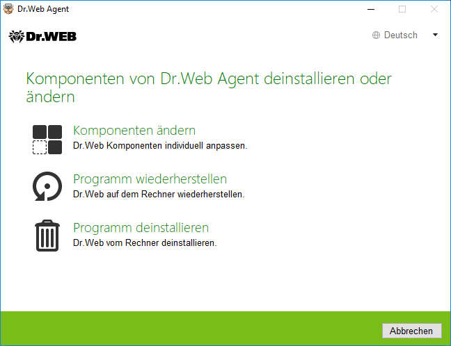 1.Um bestimmte Komponenten von Dr.Web zu entfernen oder hinzuzufügen, navigieren Sie in der Windows-Systemsteuerung zum Abschnitt, der zur Installation und Deinstallation der Software dient. 2.Suchen Sie in der Liste der installierten Software nach dem Programm. 3.Klicken Sie auf Ändern. Das Dialogfeld des Assistenten zum Deinstallieren/Ändern der Programmkomponenten erscheint.