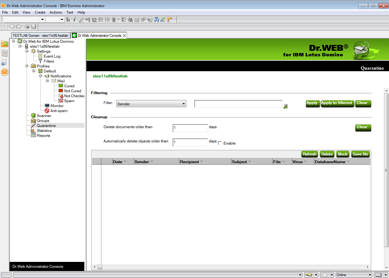 You can also specify a certain number of days in the Automatically delete objects older then field and select the Enable check box next to it to set up automatic cleanup. Automatic cleanup of documents in the Quarantine is performed by the Automatically delete objects agent in the quarantine.nsf database. By default, this agent launches every day at 01:30 AM. You can adjust its settings using standard tools of Lotus Domino (see the IBM Lotus Domino documentation: http://www.ibm.com/developerworks/lotus/documentation/domino/). To delete a document from the Quarantine: •Select it in the list and click the Delete button. To save the object, which was moved to the Quarantine, on the hard drive: •Select the object. •Click the Save file button to open a window with the file system tree. •Choose the folder where you want to save the object to and click OK. To make a document impossible to delete neither automatically nor manually: •Select it in the list and click Block. Clicking this button again will unblock the document. The list is automatically refreshed every 12 hours. However, you can refresh it manually at any time by clicking the Refresh button.