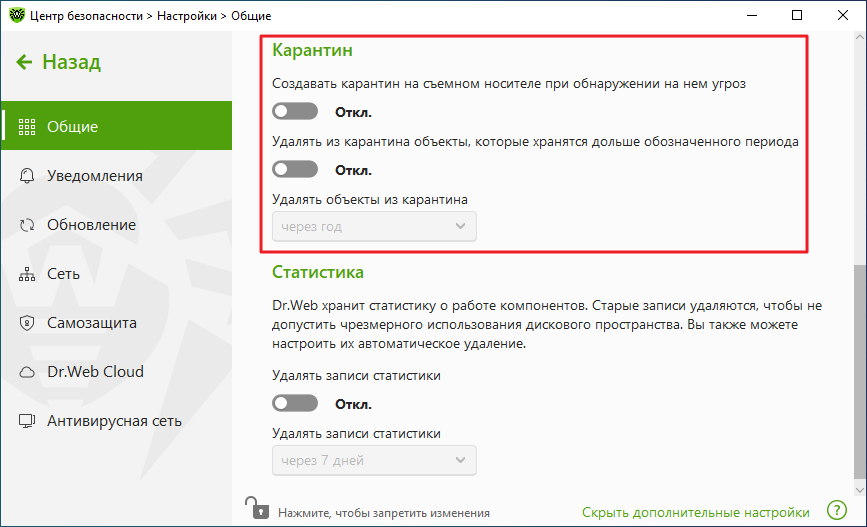 Чтобы чрезмерно не загружать диск, вы можете задать настройки хранения объектов в карантине, такие как время хранения объектов и создание папки карантина на съемном носителе. Чтобы изменить настройки хранения обнаруженных угроз 1.В окне изменения общих настроек нажмите ссылку Дополнительные настройки. 2.В разделе настроек Карантин включите или отключите необходимую опцию при помощи переключателя ![]() Рисунок 26. Настройки карантина 3.При включении автоматического удаления объектов из карантина в выпадающем меню выберите время. Объекты, хранящиеся дольше указанного срока, будут удаляться. Создание карантина на съемном носителе Опция Создавать карантин на съемном носителе при обнаружении на нем угроз позволяет при обнаружении угрозы на съемном носителе создавать папку карантина на том же носителе и помещать в эту папку угрозы без предварительного шифрования. На съемном носителе папка карантина создается, только если возможна запись на носитель. Использование отдельных папок и отказ от шифрования на съемных носителях позволяет предотвратить возможную потерю данных. Если опция отключена, обнаруженные на съемных носителях угрозы помещаются в карантин на локальном диске. Автоматическое удаление объектов из карантина Чтобы избежать чрезмерного использования места на диске, включите автоматическое удаление объектов из карантина. |