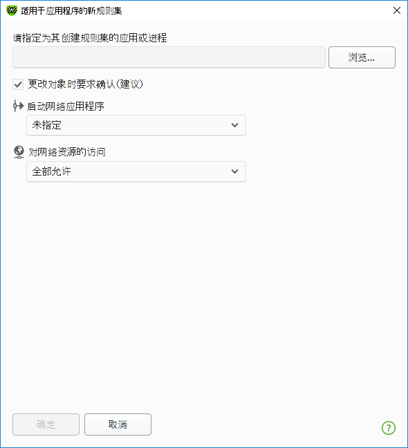 3.必要时可修改预先设定的应用程序规则集或者创建新的应用程序规则集。 4.如果用户选择创建新的规则或修改已有规则,请在显示的窗口设置参数。 5.完成规则集修改时请点击确定保存修改或取消按钮撤销修改。 勾选更改对象时要求确认(建议)后更改或更新应用后会重新确认应用程序对网络资源的访问权限。 防火墙在对话模式或允许可信任应用连接模式下运行时,用户可以直接从出现未授权连接尝试的通知窗口直接创建规则。 ![]() 图54. 试图访问网络通知示例