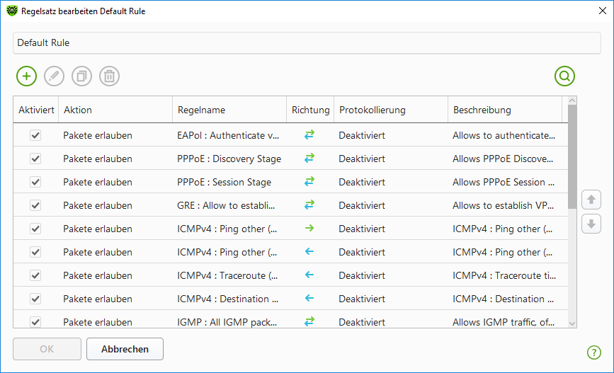 Im Dialog Regelsatz bearbeiten werden Paketfilterregeln aufgelistet, die zu einem bestimmten Satz gehören. Sie können neue Regeln hinzufügen oder die bestehenden Regeln bearbeiten und die Reihenfolge ändern, in der die Regeln angewendet werden. Eine Regel, die sich an höherer Stelle in der Liste befindet, hat Vorrang vor Regeln, die sich unten in der Liste befinden. ![]() Abbildung 57: Paketfilterregelsatz Für jede Regel in der Liste werden folgende Kurzinformationen angezeigt: