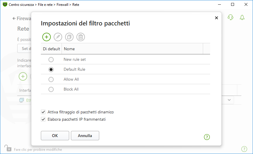 Nella finestra Rete è possibile impostare un set di regole di filtraggio dei pacchetti trasmessi attraverso una specifica interfaccia. Per andare alla finestra Rete 1.Aprire il menu Dr.Web 2.Nella finestra che si è aperta selezionare la sezione File e rete. 3.Assicurarsi che Dr.Web funzioni in modalità amministratore (il lucchetto nella parte inferiore del programma è "aperto" 4.Fare clic sulla piastrella Firewall. Si aprirà la finestra dei parametri del componente. 5.Espandere il gruppo Impostazioni avanzate. 6.Nella sezione delle impostazioni Parametri di utilizzo per le reti conosciute premere Modifica. Si aprirà una finestra con una lista di interfacce di rete per cui sono impostate le regole. ![]() Immagine 55. Set di regole per interfacce di rete 7.Trovare nella lista l'interfaccia desiderata e abbinarla al set di regole corrispondente. Se nella lista non è disponibile un set di regole adatto, crearlo. Firewall viene fornito con i seguenti set di regole predefiniti: •Default Rule — le regole che descrivono le configurazioni di rete più comuni ed attacchi diffusi (si usa di default per tutte le nuove interfacce); •Allow All — tutti i pacchetti vengono consentiti; •Block All — tutti i pacchetti vengono bloccati. Per un utilizzo comodo e un passaggio veloce tra le modalità di filtraggio, si possono impostare ulteriori set di regole. Per vedere tutte le interfacce disponibili o aggiungere alla tabella una nuova interfaccia, premere il pulsante Le interfacce di rete non attive possono essere cancellate dalla tabella visualizzata, premendo il pulsante Per visualizzare i parametri di un'interfaccia di rete, fare clic sul suo nome. Impostazioni del filtro pacchetti Per gestire i set di regole esistenti e per aggiungerne nuovi, andare alla finestra Impostazioni del filtro pacchetti premendo il pulsante Set di regole. ![]() Immagine 56. Finestra Impostazioni del filtro pacchetti Su questa pagina è possibile: •gestire i set di regole di filtraggio creando nuove regole, modificando quelle esistenti o eliminando regole non richieste; •impostare i parametri di filtraggio addizionali. Per gestire un set di regole, eseguire una delle seguenti azioni: •per creare un set di regole per un'interfaccia di rete, premere •per modificare un set di regole esistente, selezionarlo dalla lista e premere •per aggiungere una copia di un set di regole esistente, premere •per rimuovere un set di regole selezionato, premere Per configurare le impostazioni avanzate del filtraggio pacchetti, nella finestra Impostazioni del filtro pacchetti selezionare i seguenti flag: