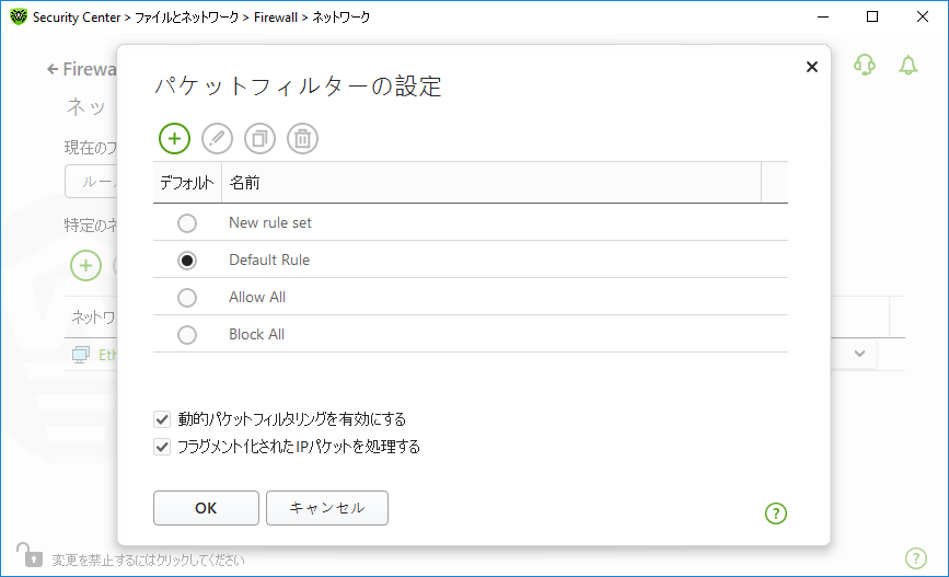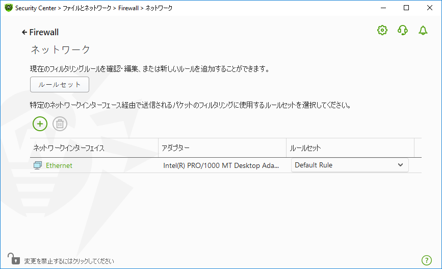 ネットワーク ウィンドウでは、特定のインターフェースを介して送信されたパケットをフィルタリングするためのルールセットを作成できます。 ネットワーク ウィンドウを開くには 1.Dr.Web メニュー 2.開いたウィンドウで、ファイルとネットワーク セクションを選択します。 3.Dr.Webが 管理者モード で動作していることを確認してください(プログラムウィンドウ下部にあるロックが開いています 4.Firewall タイルをクリックします。コンポーネントの設定ウィンドウが開きます。 5.アドバンス設定 グループを開きます。 6.アプリケーションルール セクションで、変更 をクリックします。ネットワークインターフェースの一覧が表示されたウィンドウが開きます。これらのネットワークインターフェースには、ルールが設定されています。 ![]() 図55. ネットワークインターフェースのルールセット 7.必要なインターフェースに対して、適切なルールセットを選択します。適切なルールセットが存在しない場合は、作成 できます。 Firewall のデフォルトのフィルタリングルールセットは次のとおりです: •デフォルトルール - このルールセットは、新しい ネットワークインターフェース に対してデフォルトで使用されます。 •全て許可 - すべてのパケットを通過させます。 •全てブロック - すべてのパケットをブロックします。 フィルタリングモード間の切り替えを簡単にするために、フィルタリングルールのを作成 することができます。 使用可能なすべてのインターフェースをリストに表示させる、または新しいインターフェースをリストに加えるには