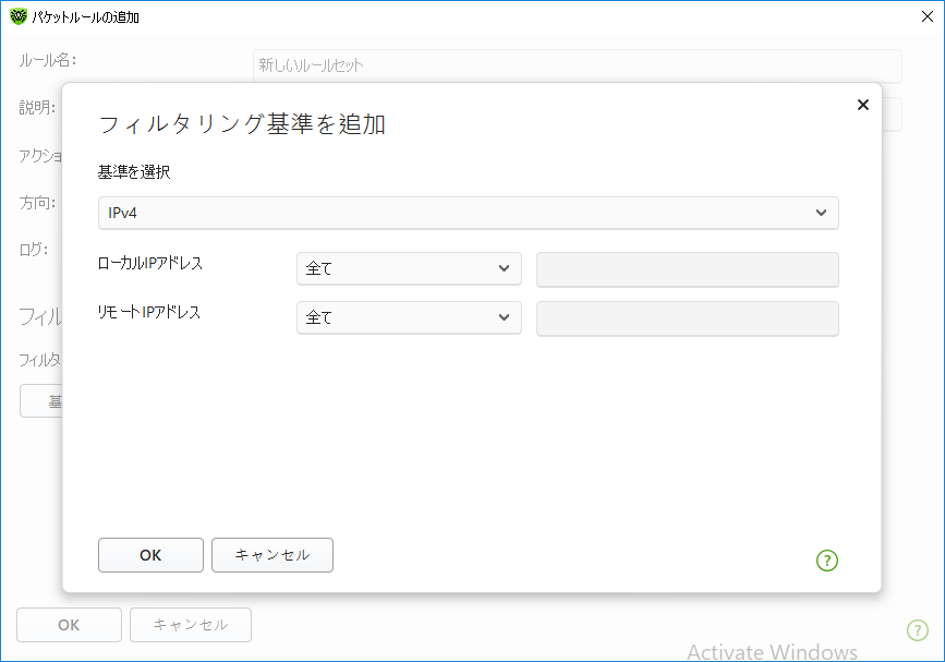 ローカルIPアドレス および リモートIPアドレス で 全て を選択した場合、IPv4ヘッダを含むすべてのパケットに対してルールが適用されます。ローカルIPアドレス はFirewallが設定されているコンピューターのネットワークアダプターのIPアドレスで、リモートIPアドレス は着信パケットをそこから受信するホスト、または発信パケットがそこにルーティングされるホストのアドレスです。 |